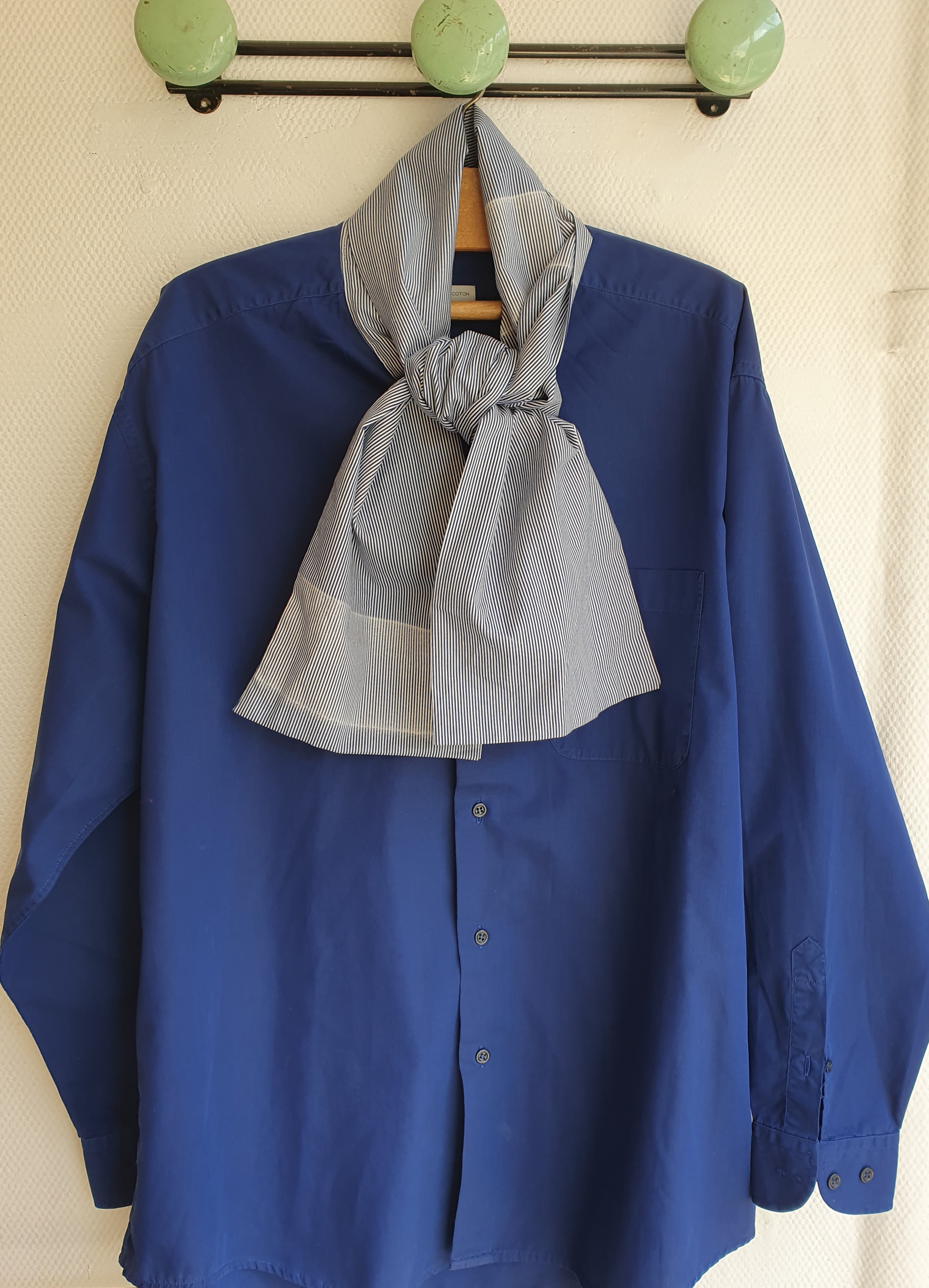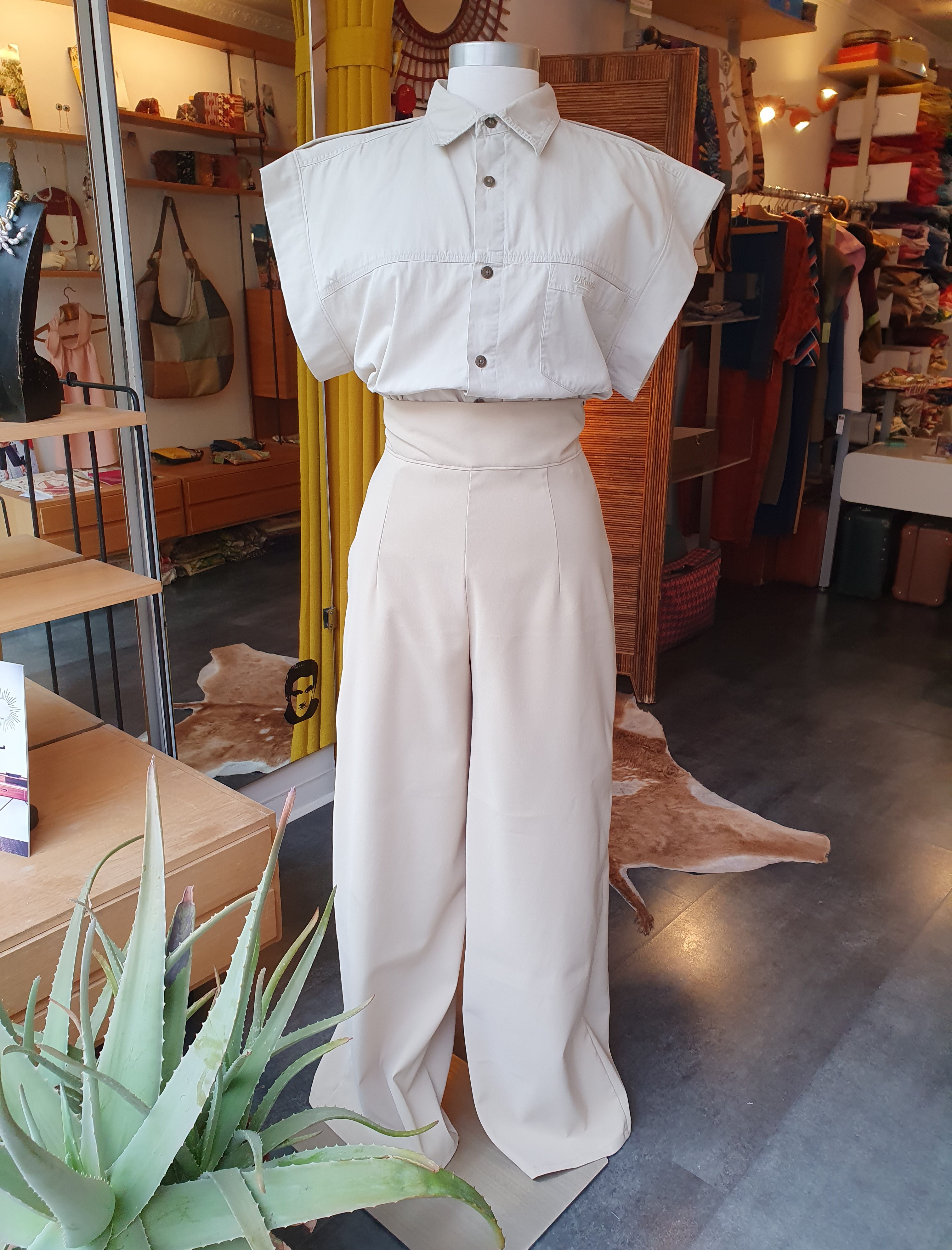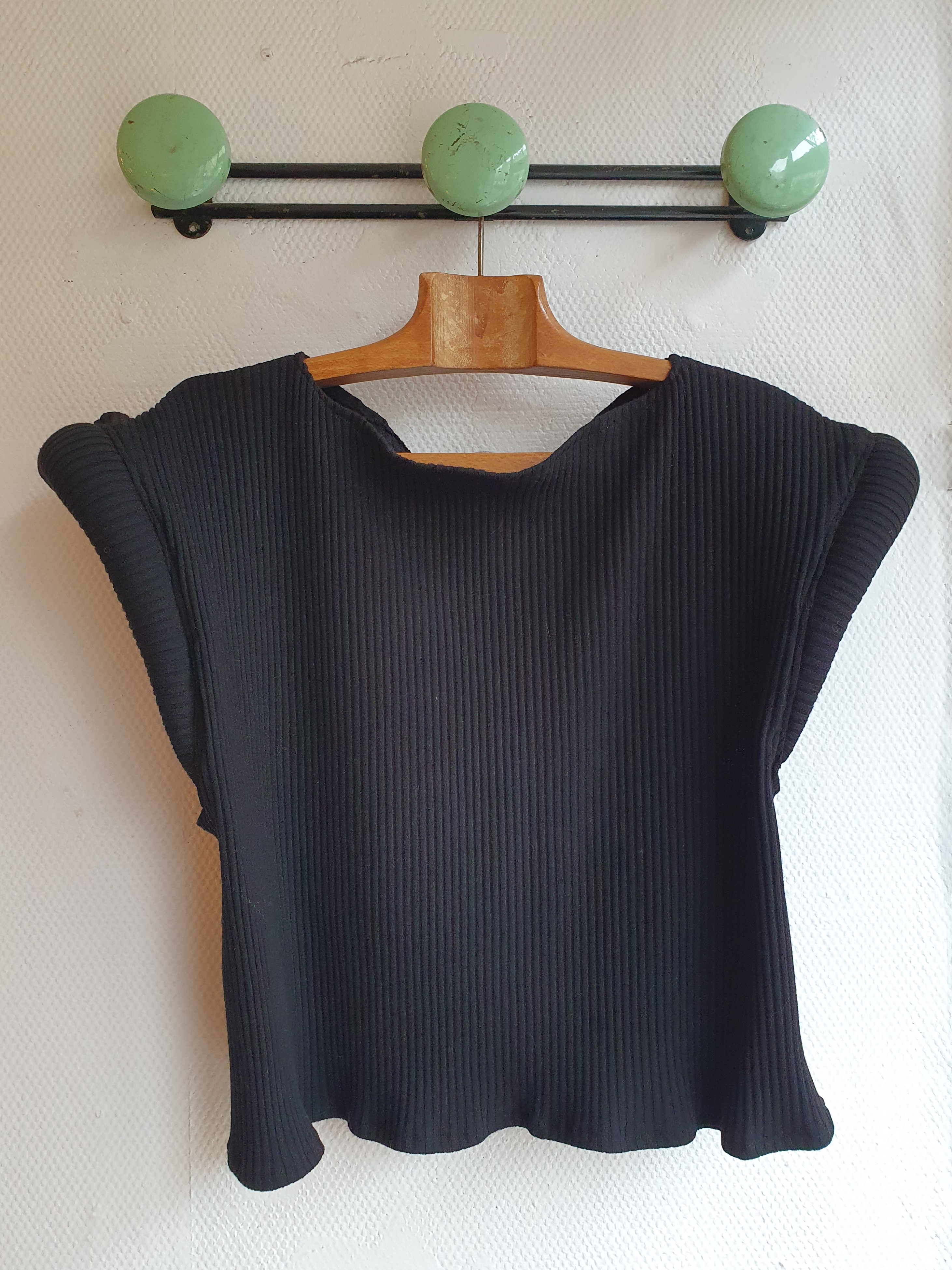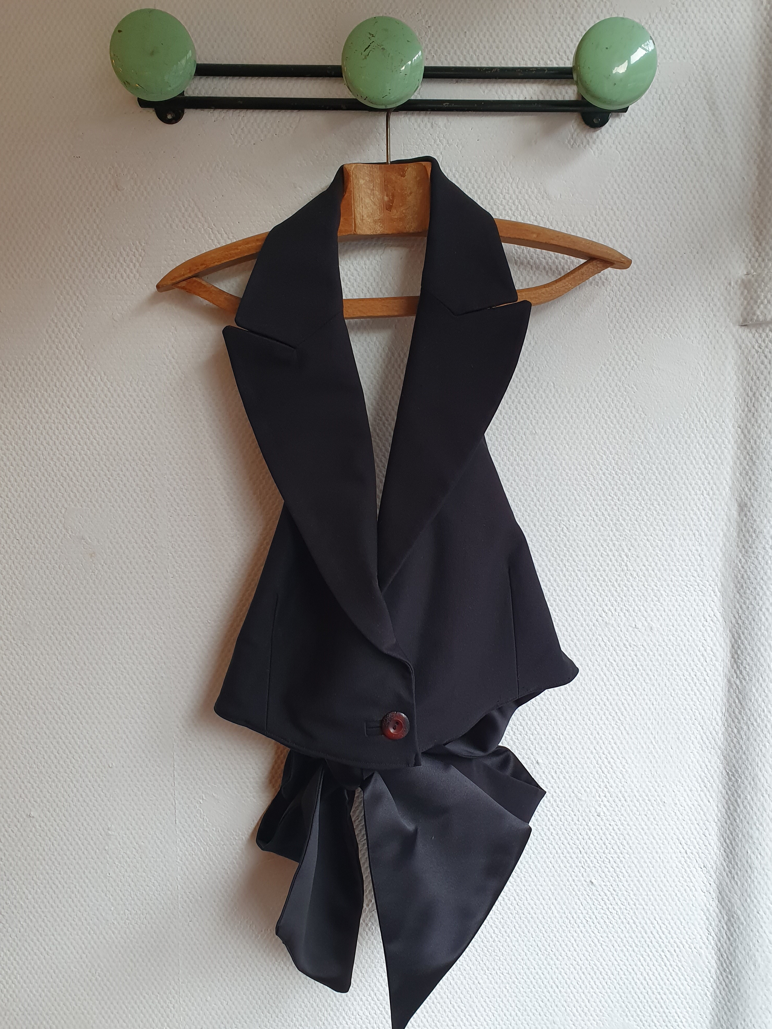 Un gilet dos-nu à porter de façon habillée (avec ou sans chemise, avec jupe crayon ou pantalon habillé), ou tout simplement avec un jean. Grand noeud dans le dos. Ne convient pas aux poitrines généreuses. Polyester. T. 36. PIECE UNIQUE