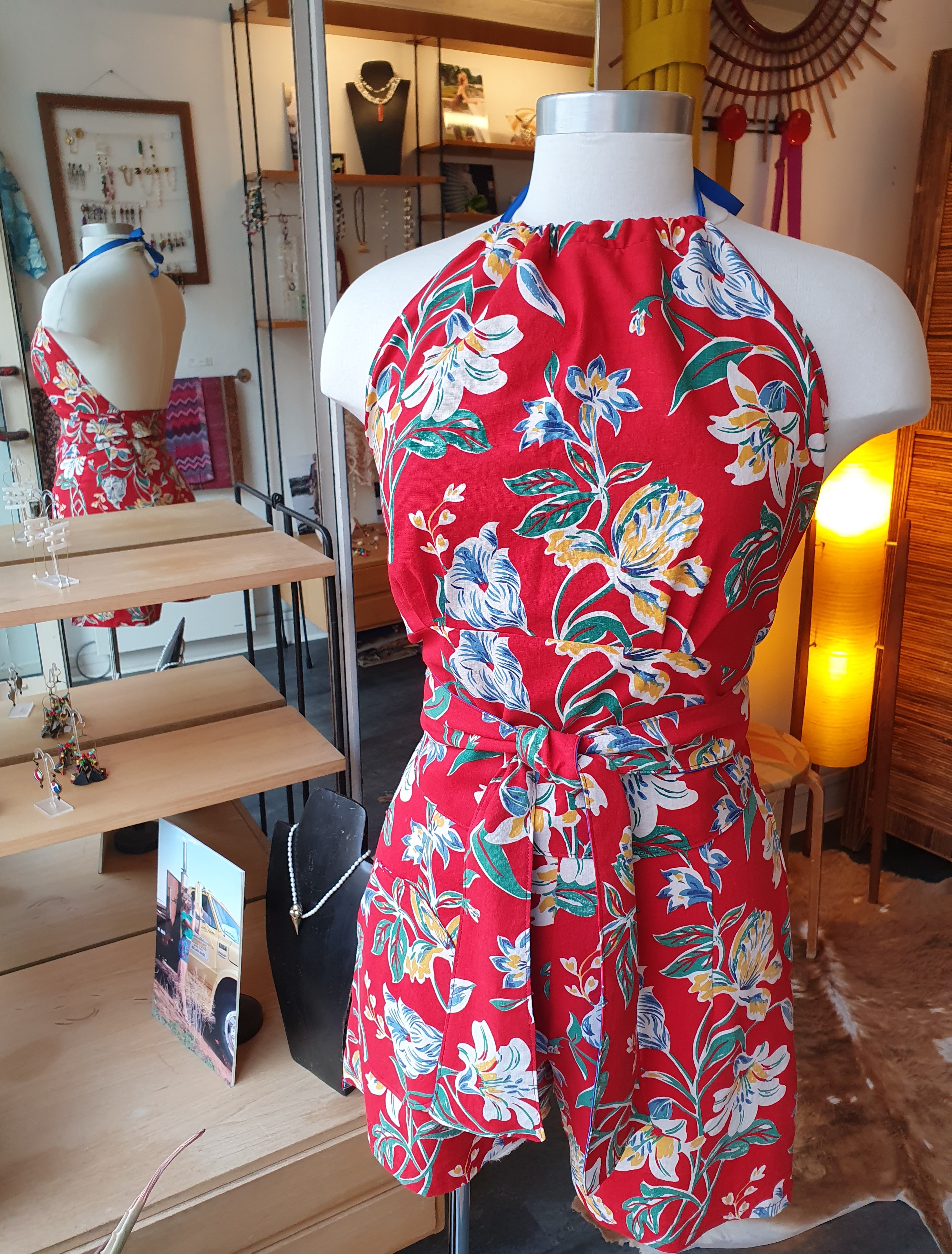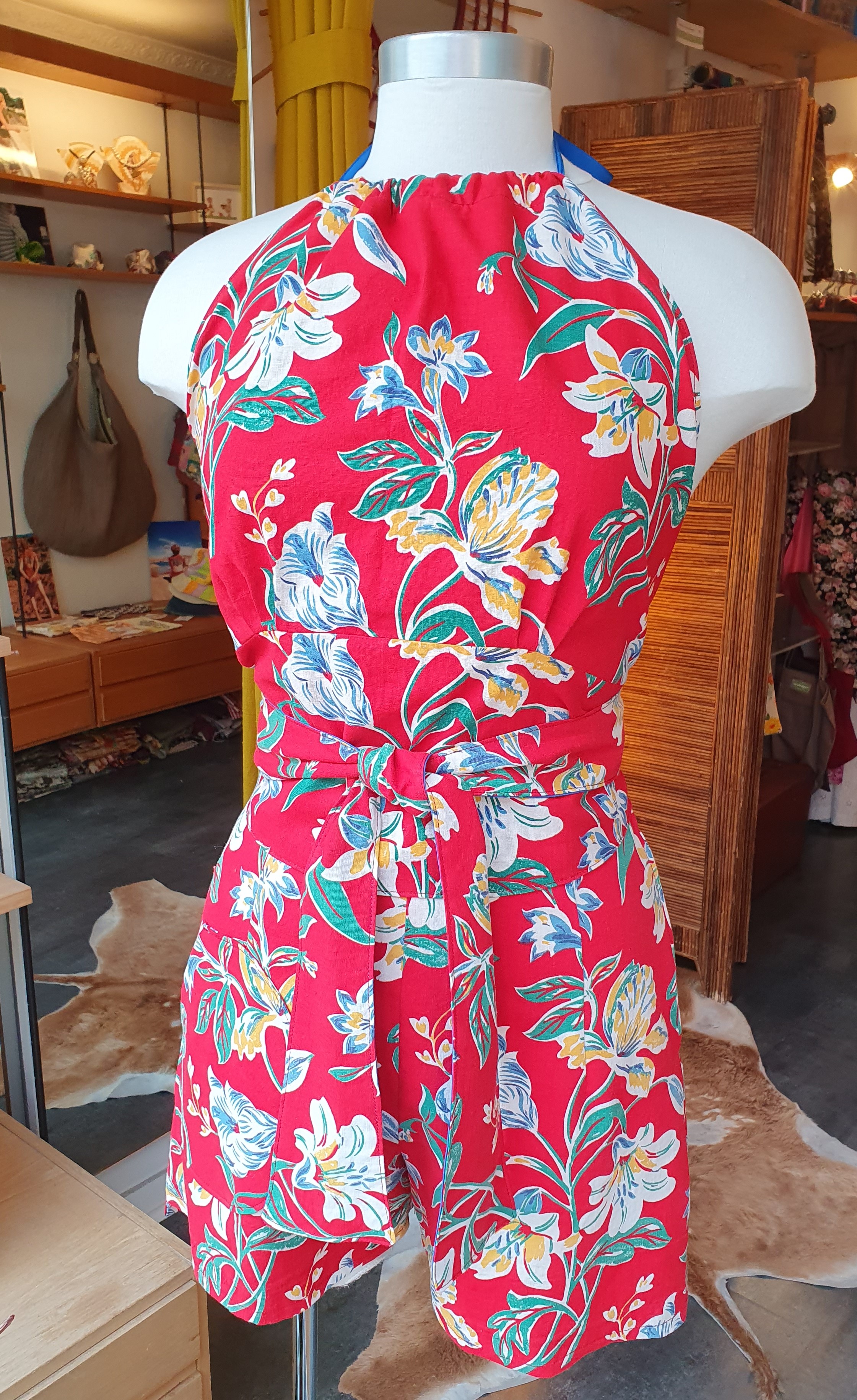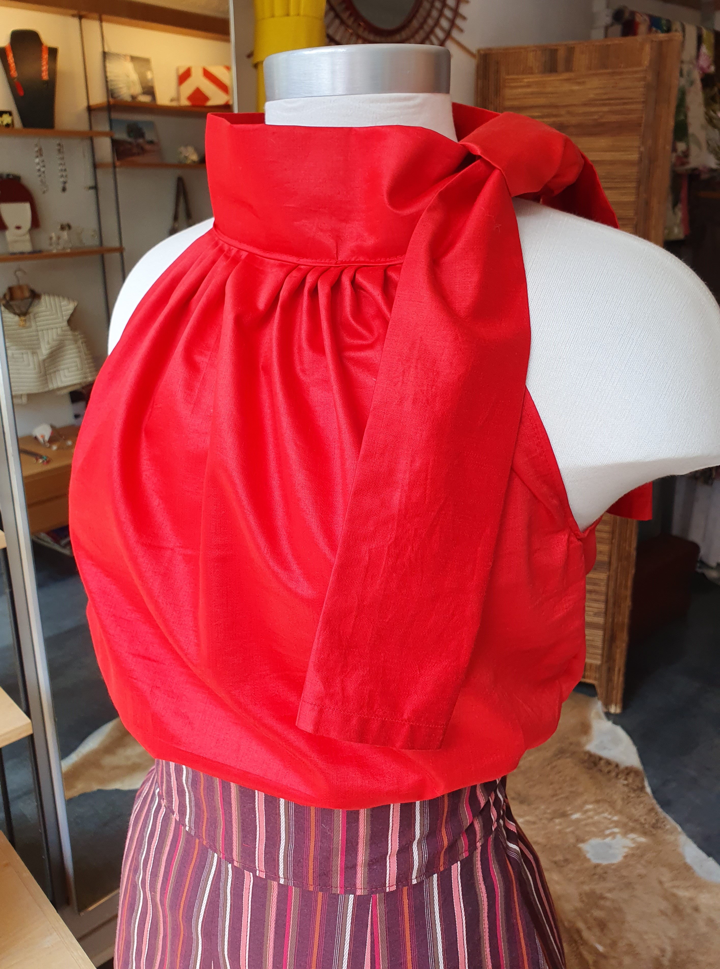 A halter top that can be adjusted to fit different bust lengths and cup sizes(it is very important that the pleats fall just beneath the breasts). Cotton with cotton lining. Fits sizes 36-40 and cup sizes A-C. ONE OF A KIND