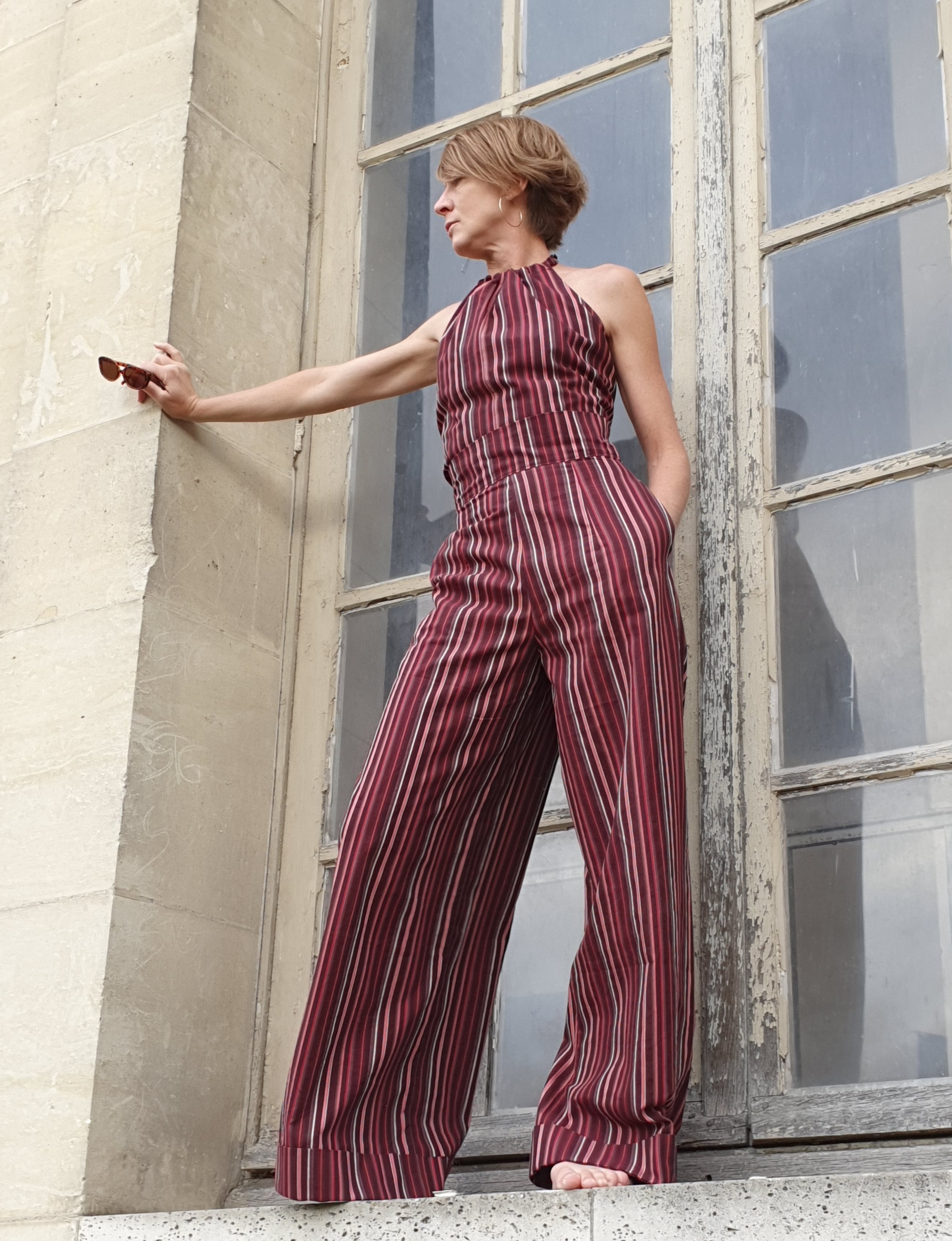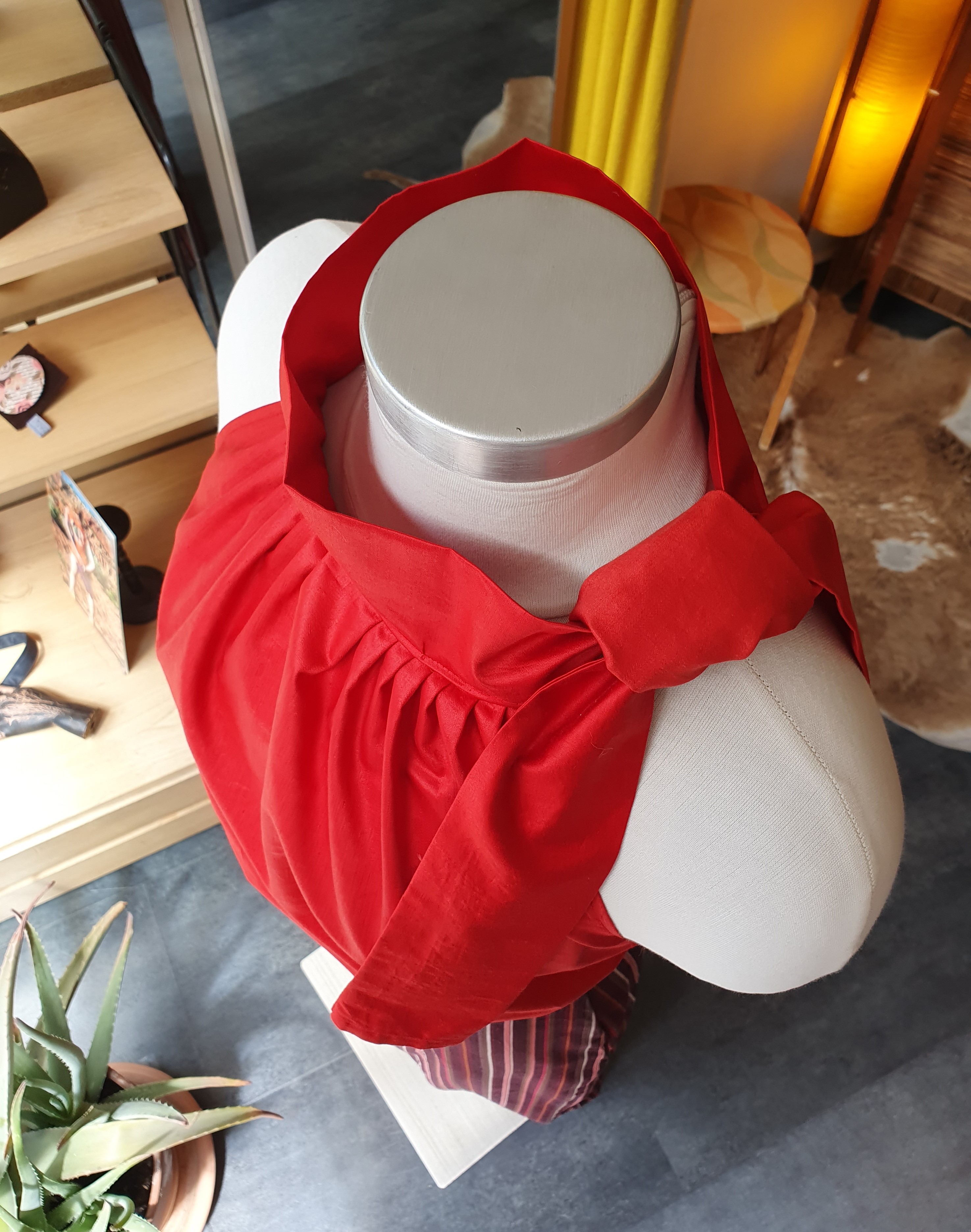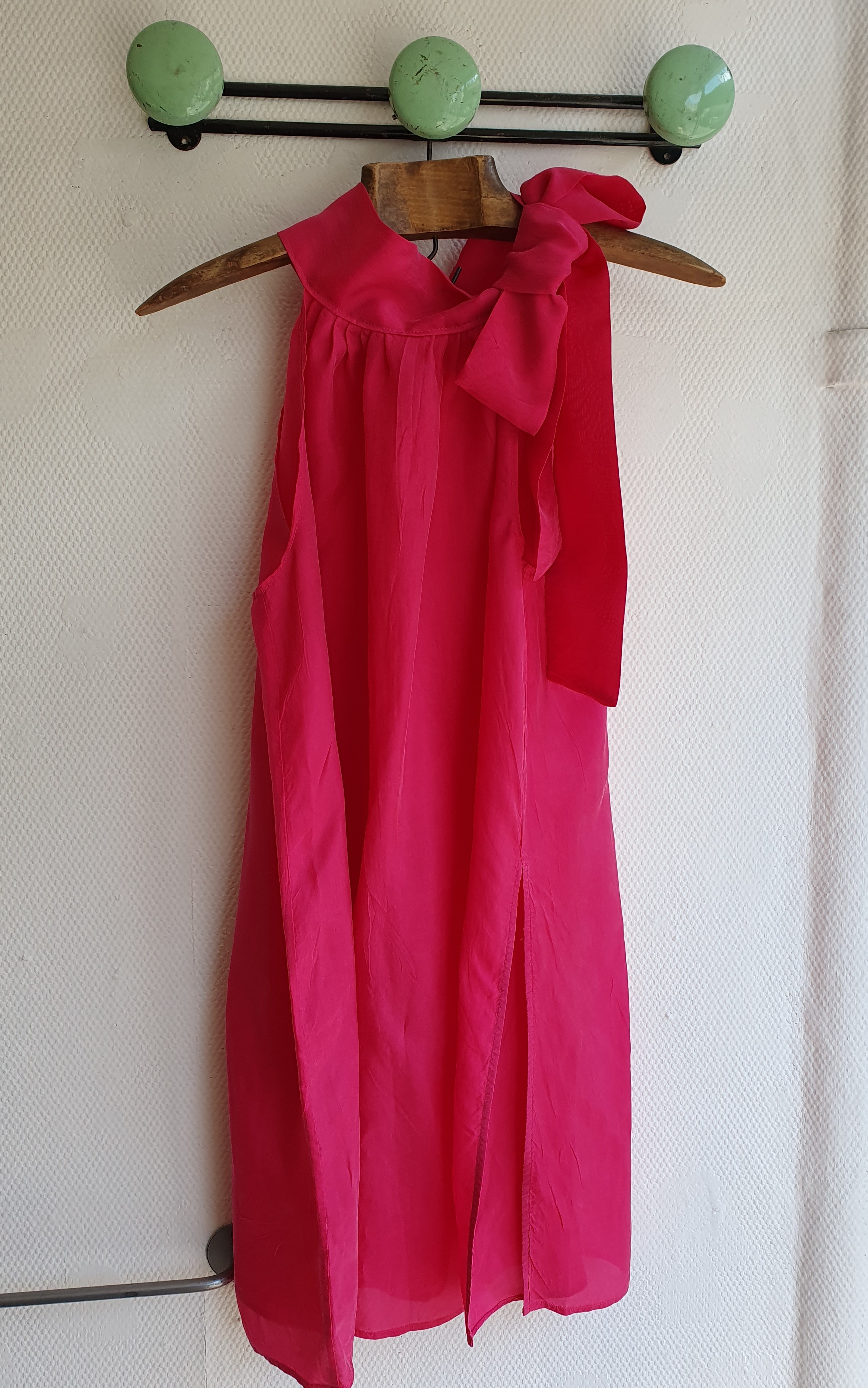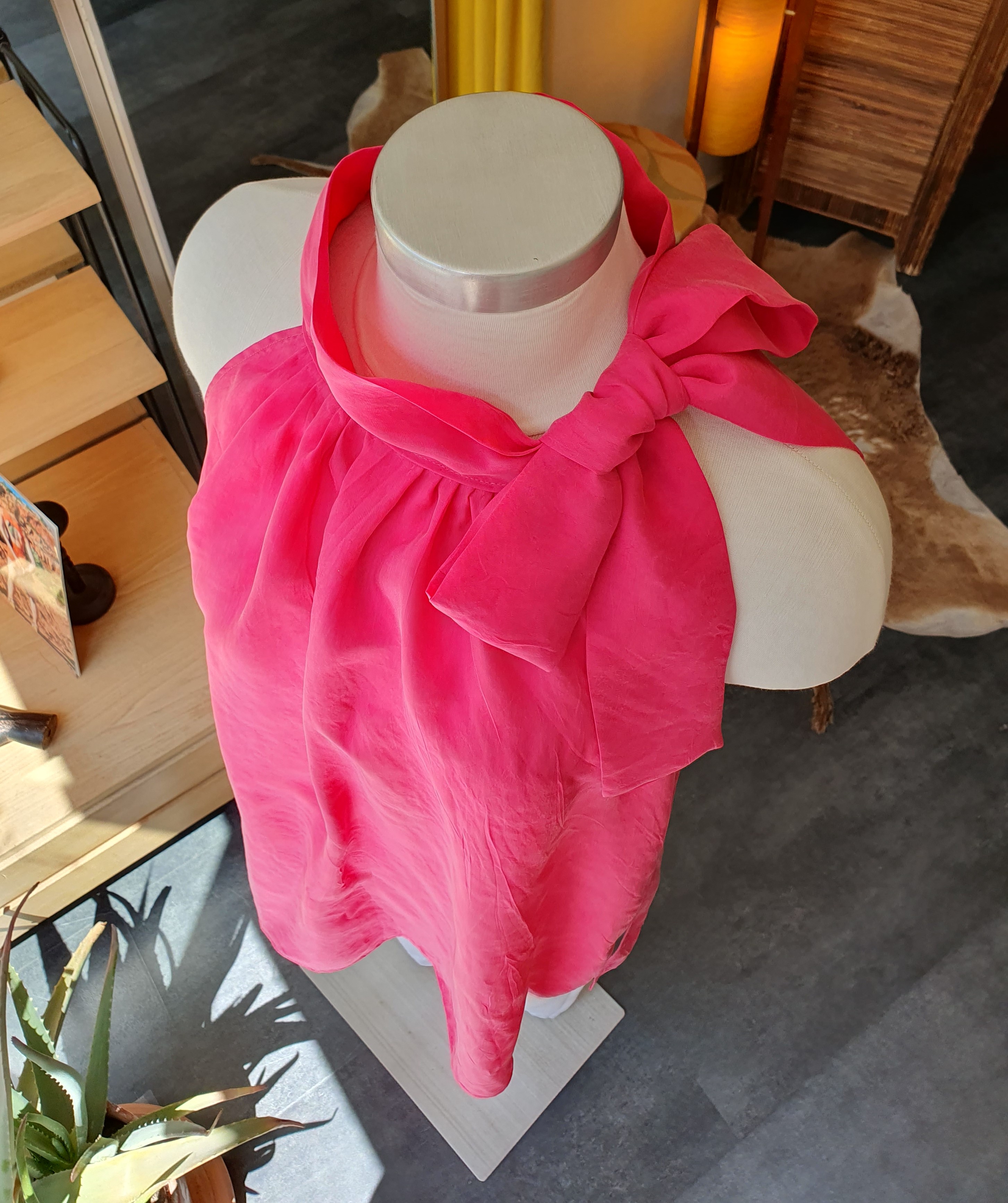 A halter top that can be adjusted to fit different bust lengths and cup sizes(it is very important that the pleats fall just beneath the breasts). Cotton with cotton lining. Fits sizes 36-40 and cup sizes A-C. ONE OF A KIND