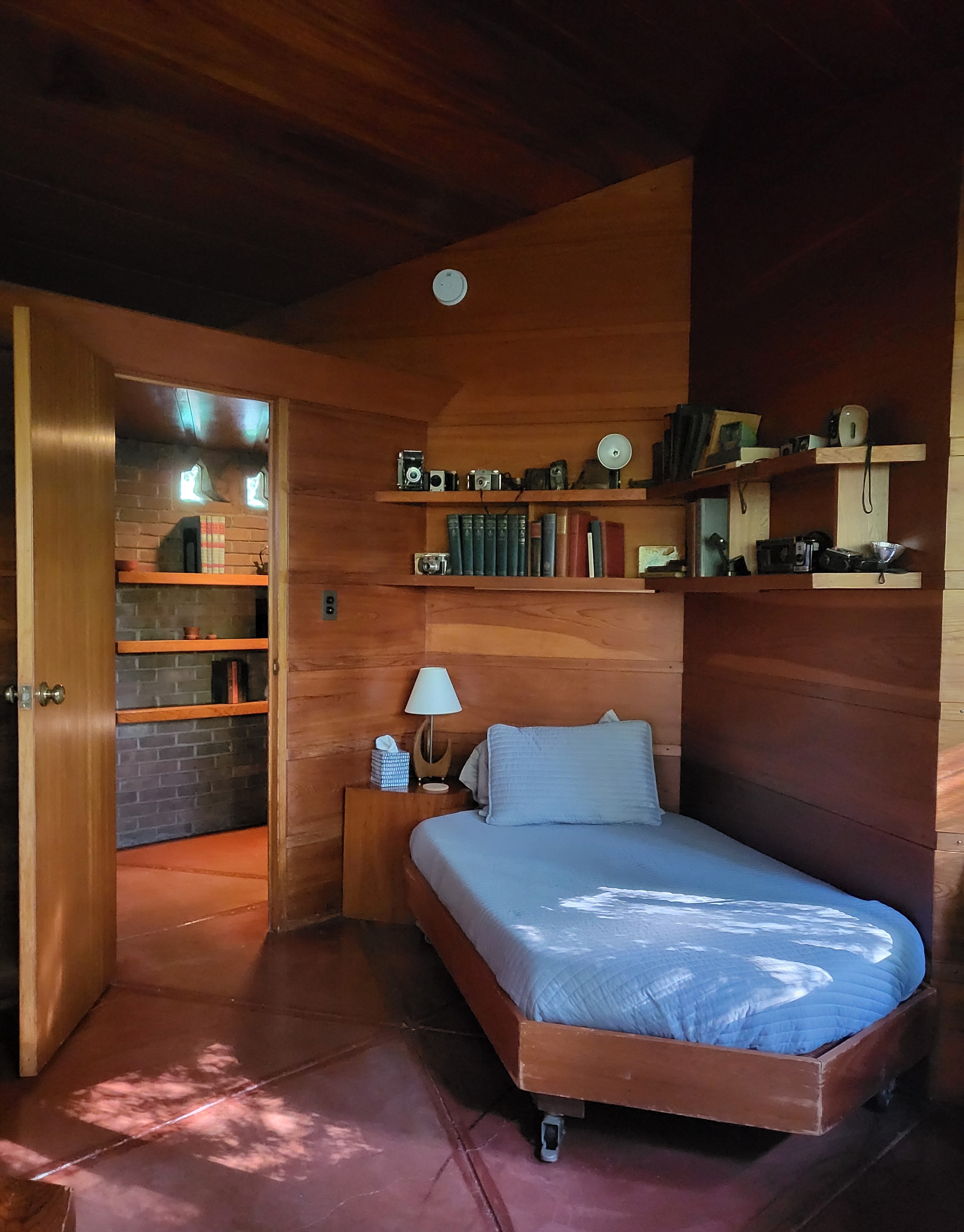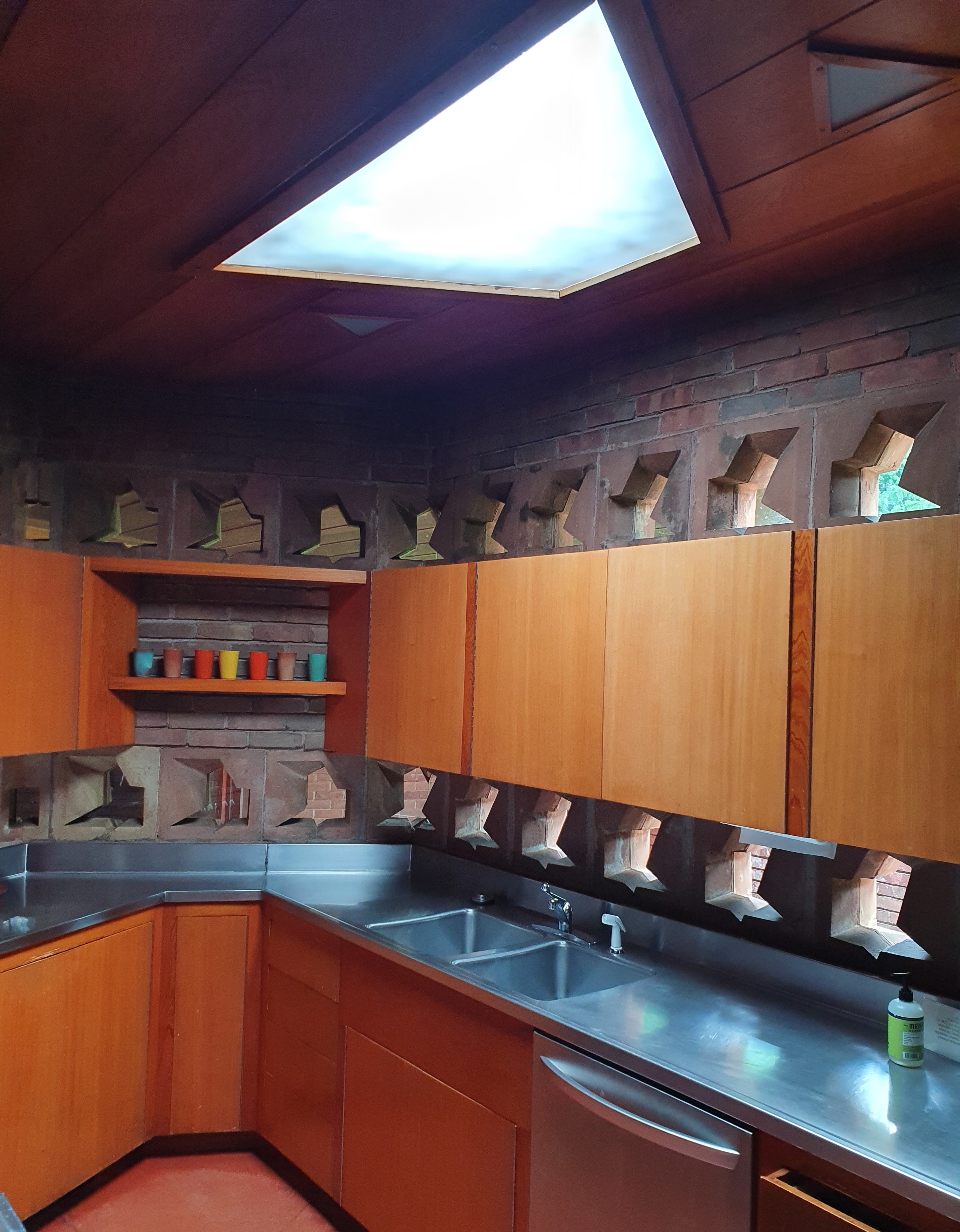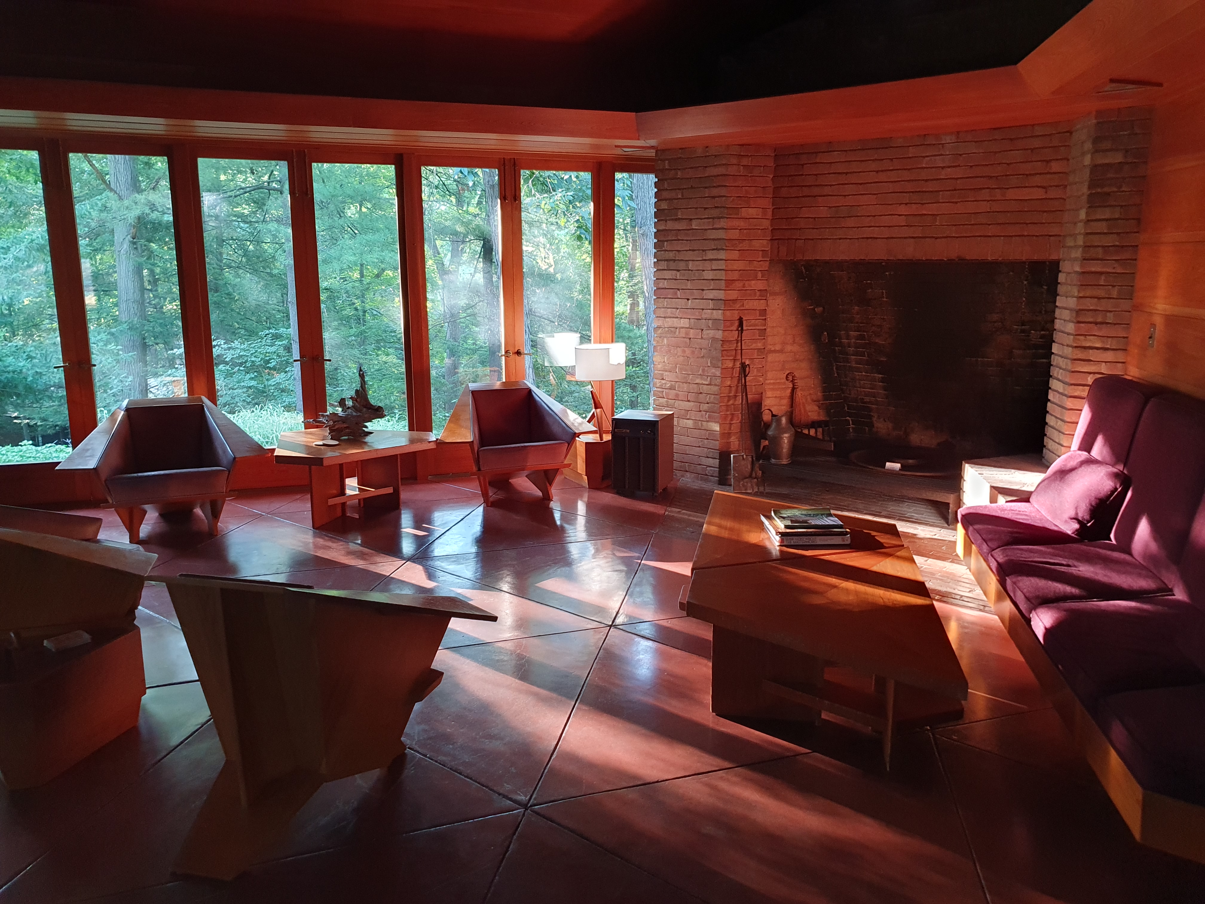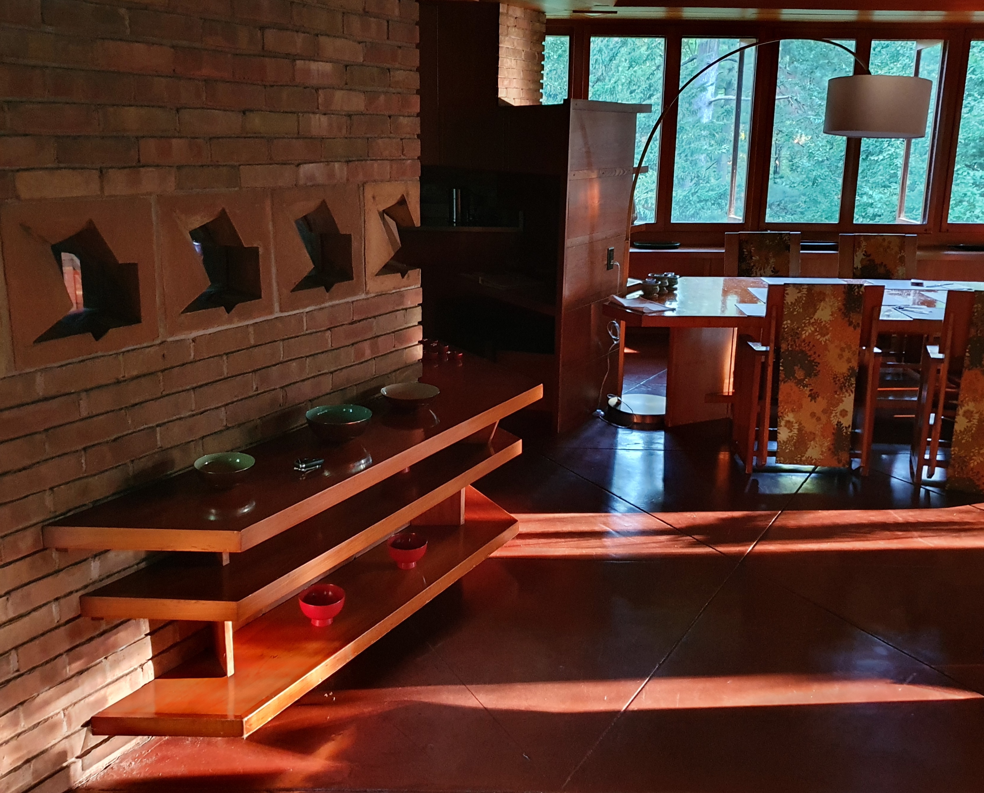 L'intérieur de la Palmer House est, comme beaucoup de maisons de Wright, pas très lumineuse, mais point triste pour autant. Le mobilier -- d'origine -- a également été dessiné par Wright. Il ne faut pas être large pour habiter ici (cf. la photo de ma fille dans l'embrasure de la porte de la salle de bains). J'ai failli partir avec les tapisseries des chaises dans ma valise, mais la raison m'a rattrapé. ;)