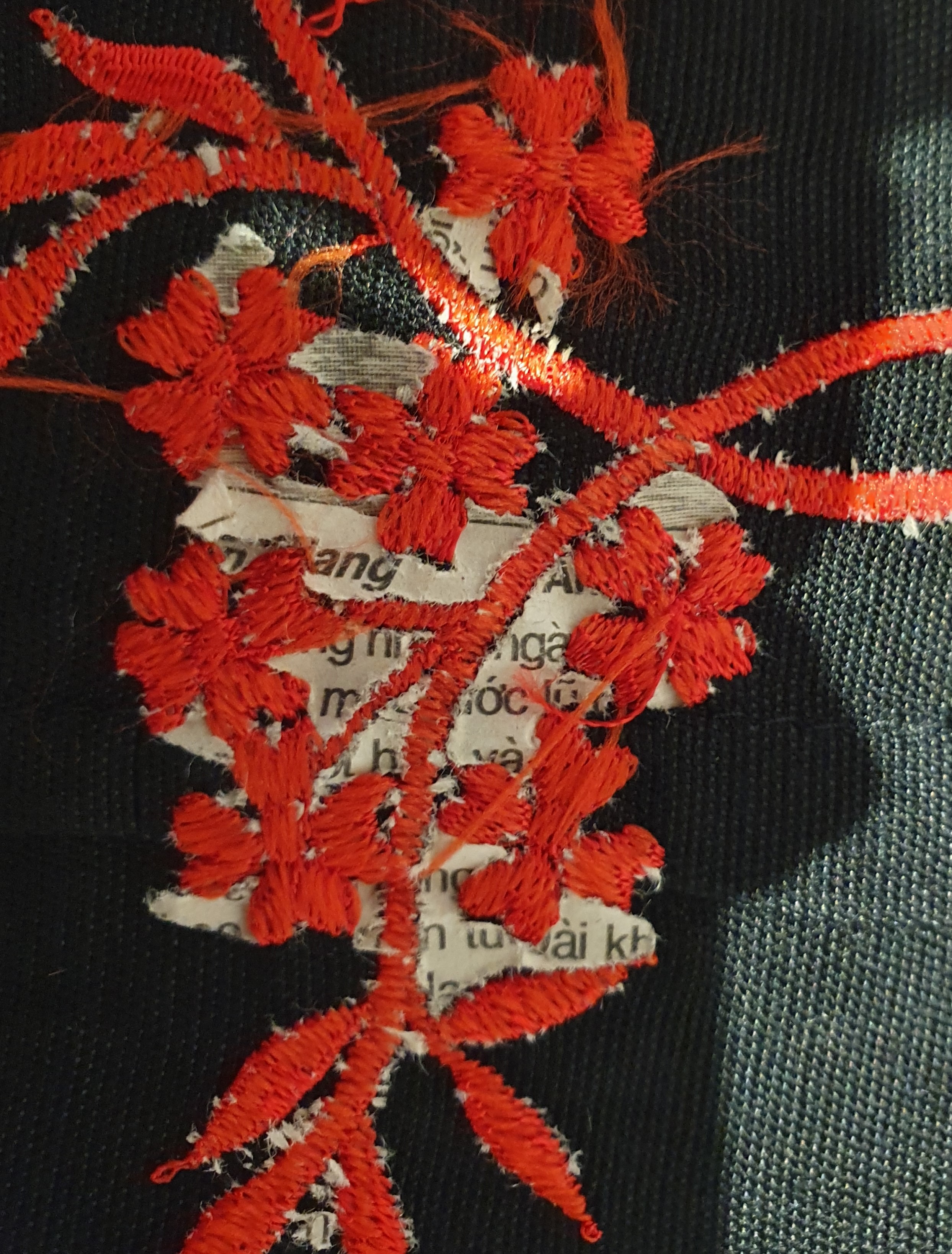 Il y a parfois des trésors cachés qui se révèlent lors du dépeçage d'un vêtement. Ici, au dos d'une broderie industrielle, j'ai trouvé du papier journal à la place du non-tissé que l'on met habituellement au dos du tissu lors de la broderie afin de renforcer le tissu.